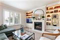 A superb second reception room overlooking the private west-facing garden, featuring a limestone fireplace and double doors opening directly onto the patio, ideal for entertaining and seamless indoor-outdoor living.