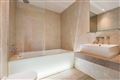 Bathroom (2.28m x 1.81m): Marble floor and wall tiles, wall-mounted toilet, floating vanity unit, bath with shower screen.